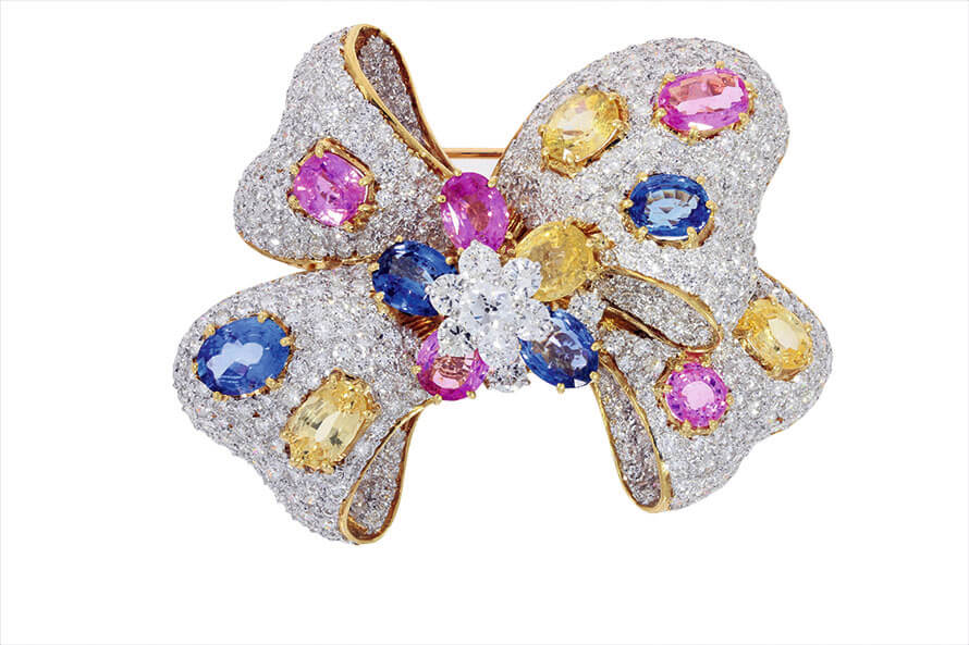 Vintagelove: Brosche aus 750f Gelbgold, mit ca. 12 Stk. mehrfarbig Saphire und ca. 7,5 Karat Diamanten