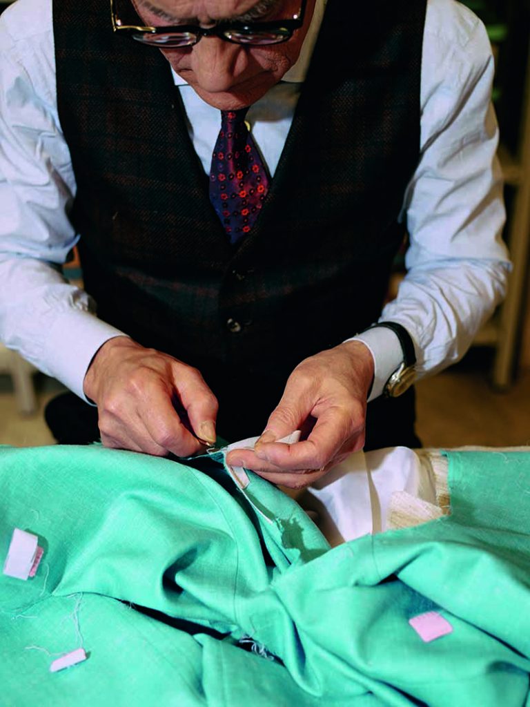 Jeder Kiton-Anzug wird von Hand zugeschnitten und geheftet, auf den Einsatz von Maschinen wird verzichtet.